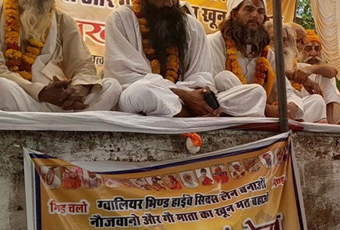 भिंड हाइवे को सिक्सलेन बनाने, गो अभ्यारण की मांग को लेकर शहर के खंडा रोड पर संतों का अखंड आंदोलन...