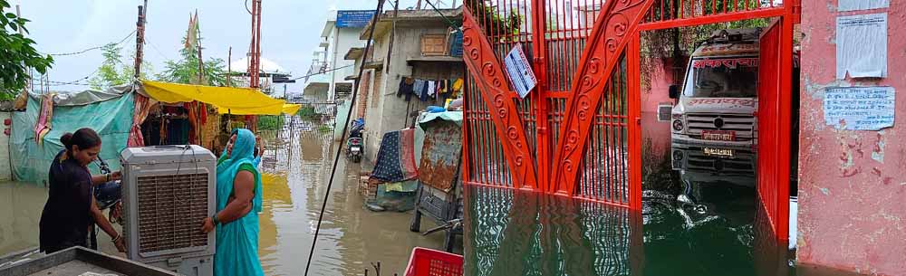 दशाश्वमेध घाट की तीन सीढ़ियां बची हैं। शीतला घाट पर मंदिर पूरी तरह से पानी में समाहित हो चुका है और सिंधिया घाट पर रत्नेश्वर महादेव के मंदिर के शिखर का कुछ हिस्सा ही नजर आ रहा है। नमो घाट पर बने स्क्ल्पचर भी डूब गए हैं। लोग घरों में फंसे हैं। अस्सी घाट पर गंगा का पानी सड़क पर बह रहा है। जगन्नाथ मंदिर के गेट के पास पहुंच गया है।