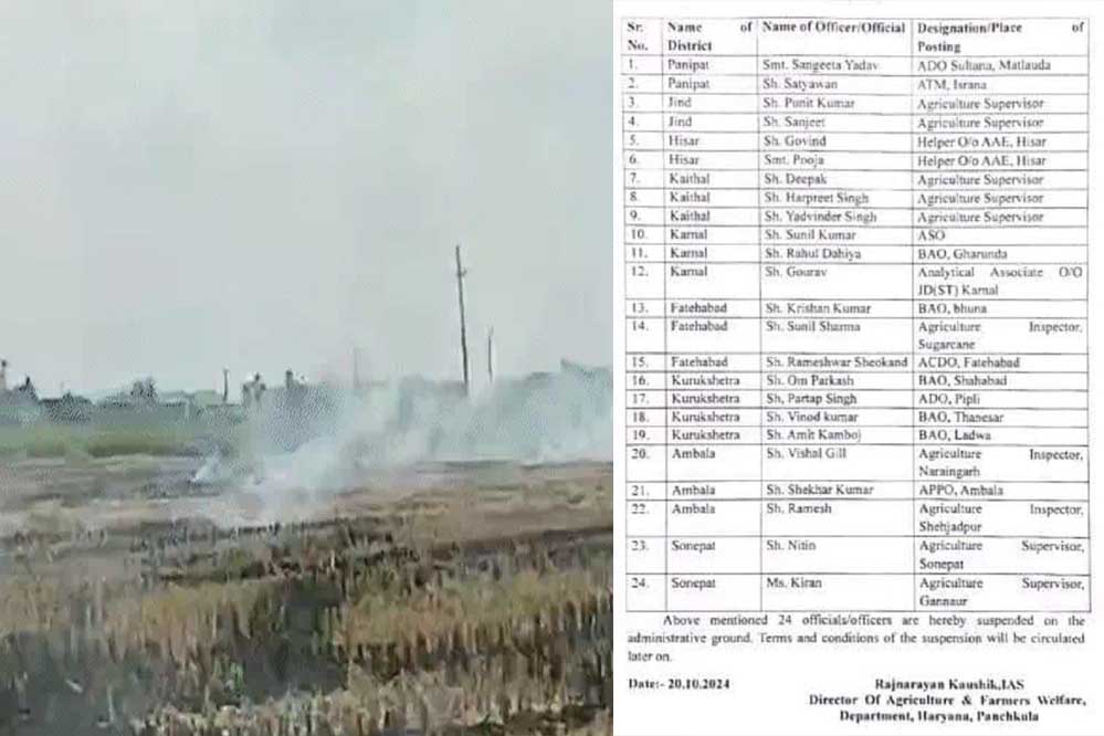 दरअसल, हरियाणा में पराली जलाने के मामले लगातार बढ़ रहे हैं और ऐसे में हरियाणा सरकार पर लगातार आरोप लग रहे हैं. मामले में सिसायत भी हो रही है और दिल्ली में प्रदूषण बढ़ रहा है. ऐसे में अब हरियाणा सरकार ने 24 अधिकारियों को एक साथ सस्पेंड कर दिया है.