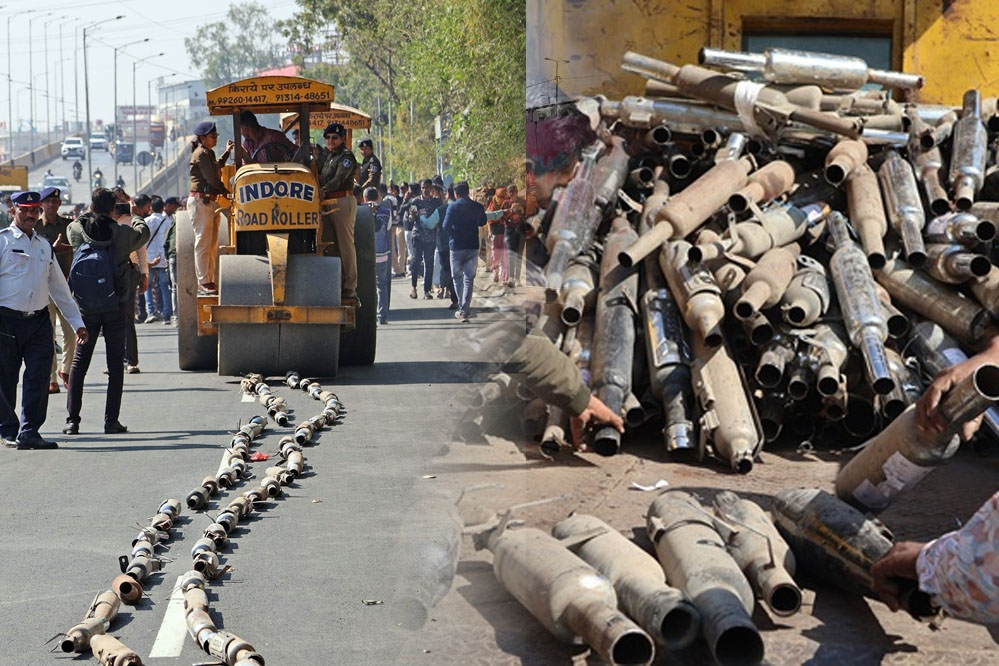 बुधवार सुबह होलकर साइंस कालेज से लगे लेकर सर्विस रोड पर यातायात प्रबंधन टीम ने कतार में एक हजार से अधिक साइलेंसर बिछाए और फिर रोड रोलर से सभी साइलेंसर को जब्त कर दिया गया।