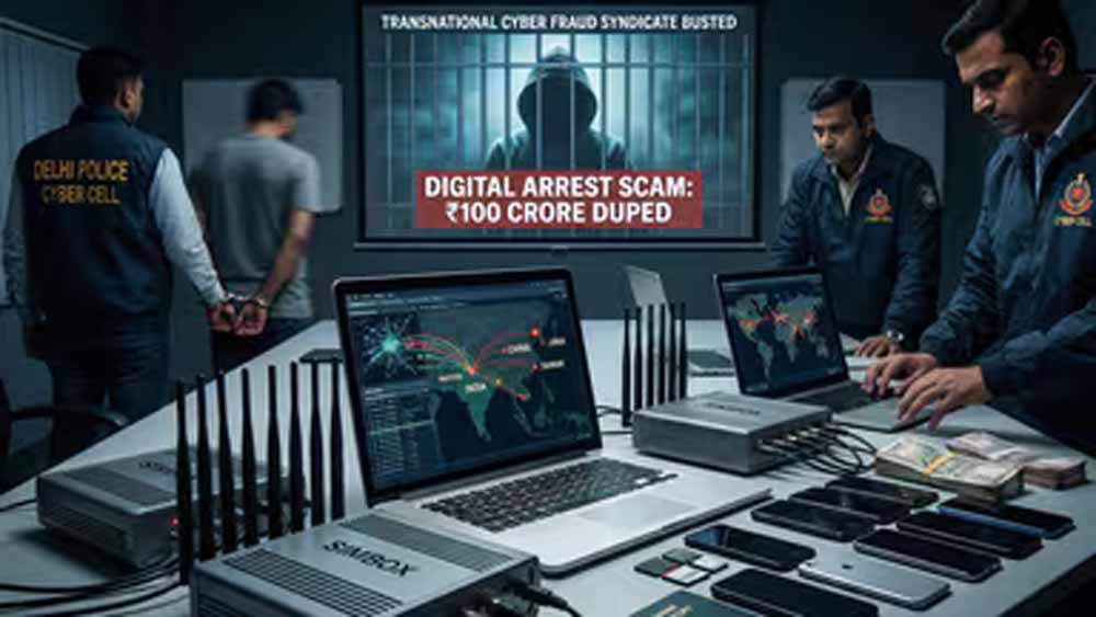 दिल्ली पुलिस ने शनिवार को एक अंतरराष्ट्रीय साइबर ठगी रैकेट का भंडाफोड़ किया है। इसमें हजारों लोगों को कथित तौर पर ‘डिजिटल अरेस्ट’ के नाम पर डरा-धमकाकर लगभग 100 करोड़ रुपये की ठगी की गई। आरोप है कि यह ठगी करने वाला गिरोह खुद को एंटी टेररिस्ट स्क्वाड (ATS) का अधिकारी बताकर लोगों को कॉल करता था और कहता था कि उनके मोबाइल नंबर आतंकवादी गतिविधियों से जुड़े मामलों में इस्तेमाल हुए हैं। इस सिंडिकेट के तार पाकिस्तान समेत कई देशों तक फैले हुए हैं। पुलिस ने अब तक 7 आरोपियों को गिरफ्तार किया है।