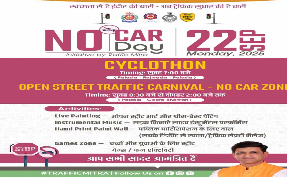 स्वच्छता और पर्यावरण संरक्षण की दिशा में लगातार नए आयाम स्थापित करने वाला इंदौर नगर निगम एक दिन वाहन को विराम देने के प्रयास के चलते प्रदूषण नियंत्रण को लेकर सक्रिय है. हर साल 22 सितंबर को शहर में नो कार मनाया जाता है. इस कड़ी में नगर निगम सोमवार 22 सितम्बर को 'नो कार डे इंदौर 2025' का आयोजन कर रहा है. इस अवसर पर गीता भवन से पलासिया तक का क्षेत्र पूरी तरह कार फ्री जोन रहेगा. आयोजन का उद्देश्य नागरिकों को निजी वाहनों की जगह पर्यावरण-मित्र साधनों जैसे साइकिल, सार्वजनिक परिवहन और पैदल चलने की ओर प्रेरित करना है.