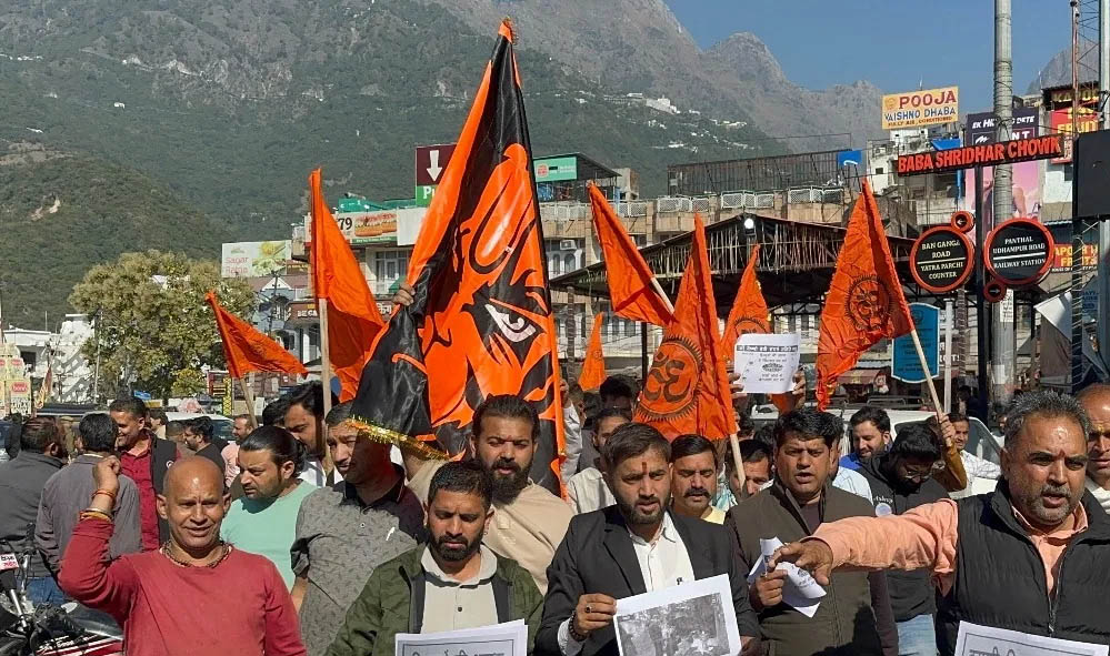 राष्ट्रीय बजरंग दल के सदस्यों ने मंगलवार को जम्मू- कश्मीर में श्री माता वैष्णो देवी इंस्टीट्यूट ऑफ मेडिकल एक्सीलेंस की MBBS एडमिशन लिस्ट को रद्द करने की मांग को लेकर प्रदर्शन (PTI)