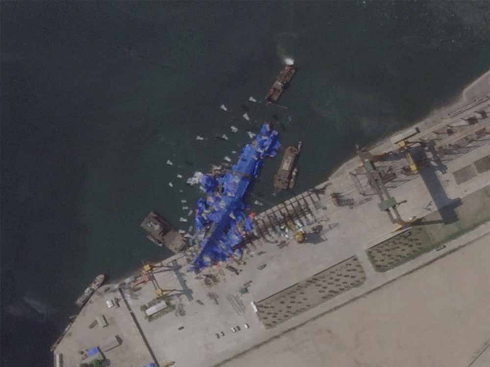 उत्तर कोरिया की नौसेना के लिए अहम माना जा रहा 5,000 टन वजनी विध्वंसक युद्धपोत अपने जलावतरण समारोह के दौरान बुधवार को क्षतिग्रस्त हो गया था। इस कार्यक्रम में उत्तर कोरिया के नेता किम भी शामिल हुए थे। उपग्रह से प्राप्त तस्वीरों में पोत स्थल पर एक ओर पड़ा हुआ और नीले रंग के कवर से ढका नजर आ रहा है। पोत के कुछ हिस्से पानी में डूबे दिख रहे हैं।