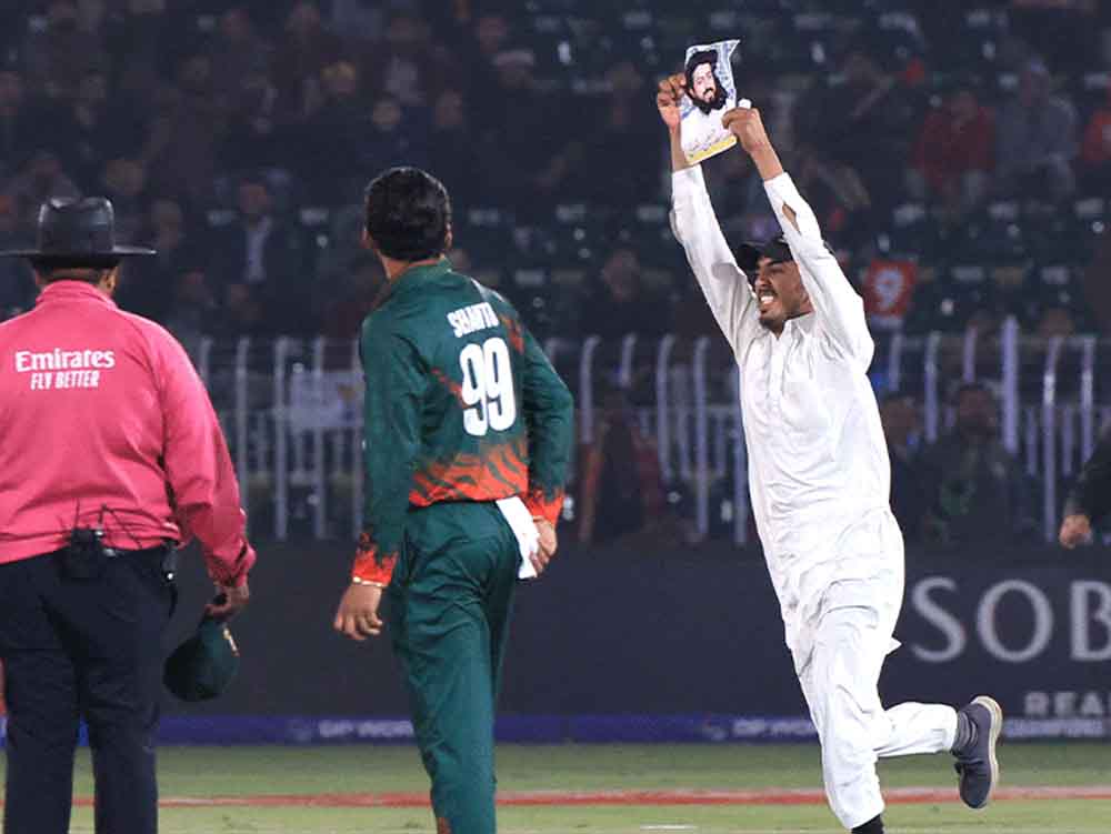 पाकिस्तान और दुबई में खेली जा रही है। इसी टूर्नामेंट का एक मुकाबला सोमवार 24 फरवरी को रावलपिंडी में बांग्लादेश और न्यूजीलैंड के बीच खेला गया। ग्रुप ए के इस मैच में जब न्यूजीलैंड की टीम टारगेट को चेज कर रही थी तो उस दौरान एक बड़ा सिक्योरिटी ब्रीच देखने को मिला, जब पाकिस्तान की एक पार्टी का एक समर्थक एक फोटो लेकर न्यूजीलैंड के खिलाड़ियों के पास पहुंच गया। पाकिस्तान क्रिकेट बोर्ड यानी पीसीबी ने फैंस की इस तरह की हरकत से बचने के लिए तमाम इंतजाम किए थे, लेकिन फिर भी सुरक्षा घेरा तोड़कर एक शख्स मैदान पर जा पहुंचा।