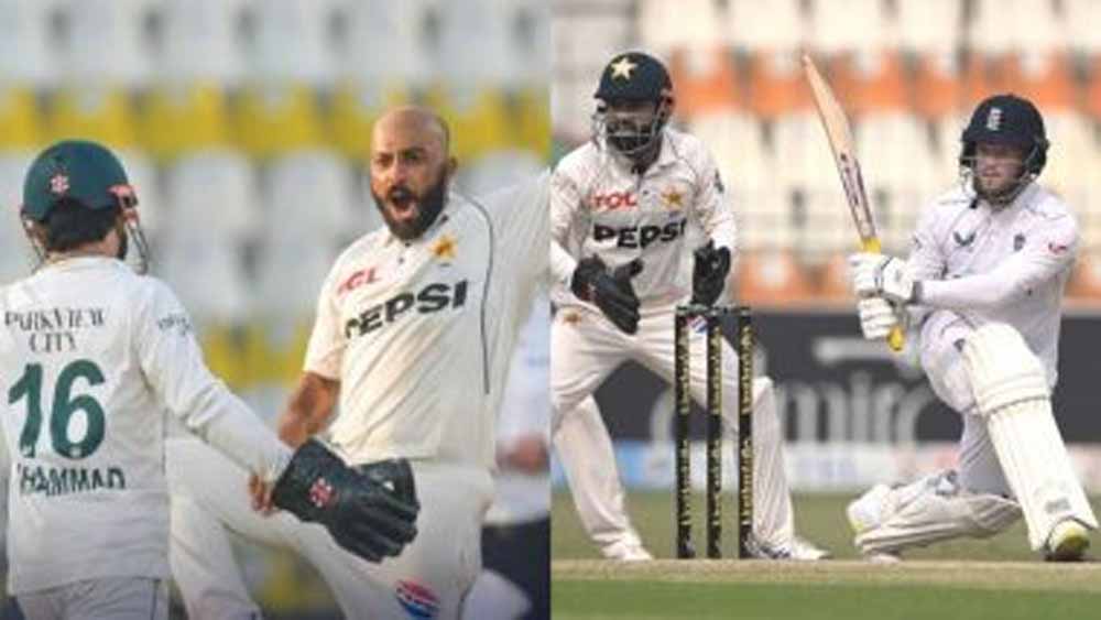 आज सुबह के सत्र में एन अली ने जो रूट (18) को आउट इंग्लैंड को चौथा झटका दिया। इसके बाद 20वें ओवर में अली ने हैरी ब्रूक (16) को भी पवेलियन भेज दिया। जेम्स स्मिथ (6), कप्तान बेन स्टोक्स (37), बाइडन कार्स (27), जैक लीच (एक) और शोएब बशीर (शून्य) को भी एन अली ने अपना शिकार बनाया। पाकिस्तान ने इंग्लैंड की पूरी टीम को 33.3 ओवर में 144 रन पर समेट दिया। पाकिस्तान की ओर से नोमान अली ने 16.3 ओवर में 46 रन देकर आठ विकेट लिये। साजिद खान को दो विकेट मिले।