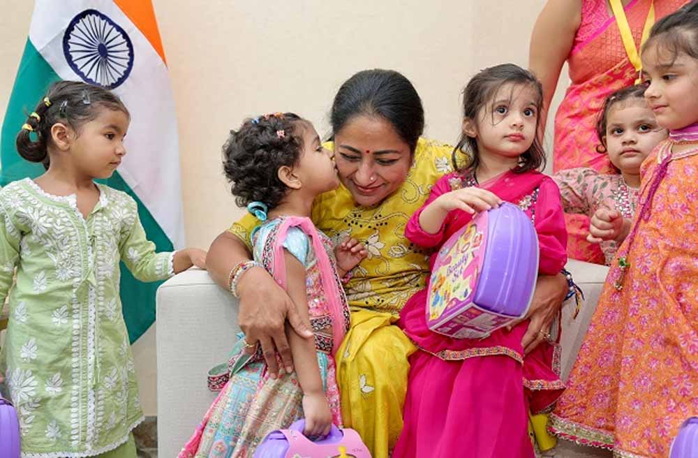 दिल्ली की मुख्यमंत्री रेखा गुप्ता ने गुरुवार को सरकारी स्कूलों के बच्चों के साथ रक्षाबंधन का त्योहार मनाया। मुख्यमंत्री ने बच्चों से प्यार से राखी बंधवाई और इन पलों की तस्वीरें अपने सोशल मीडिया हैंडल पर शेयर की हैं। तस्वीरों में वह बच्चों को दुलारती और उनसे राखी बंधवाती हुई नज़र आ रही हैं।