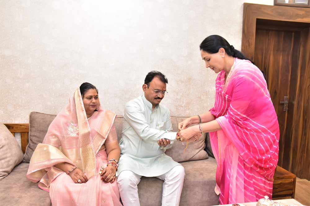 भाई-बहन के अटूट प्रेम, विश्वास और स्नेह के पावन पर्व रक्षाबंधन के अवसर पर शनिवार को उपमुख्यमंत्री श्री प्रेमचंद बैरवा के राजकीय आवास पर उनको उपमुख्यमंत्री श्रीमती दिया कुमारी ने स्नेहपूर्वक रक्षासूत्र बांधा। इस अवसर पर उन्होंने इस पर्व को भाई-बहन के पवित्र रिश्ते का उत्सव बताते हुए समाज में प्रेम, सौहार्द और आपसी सहयोग को बढ़ावा देने का संदेश दिया।