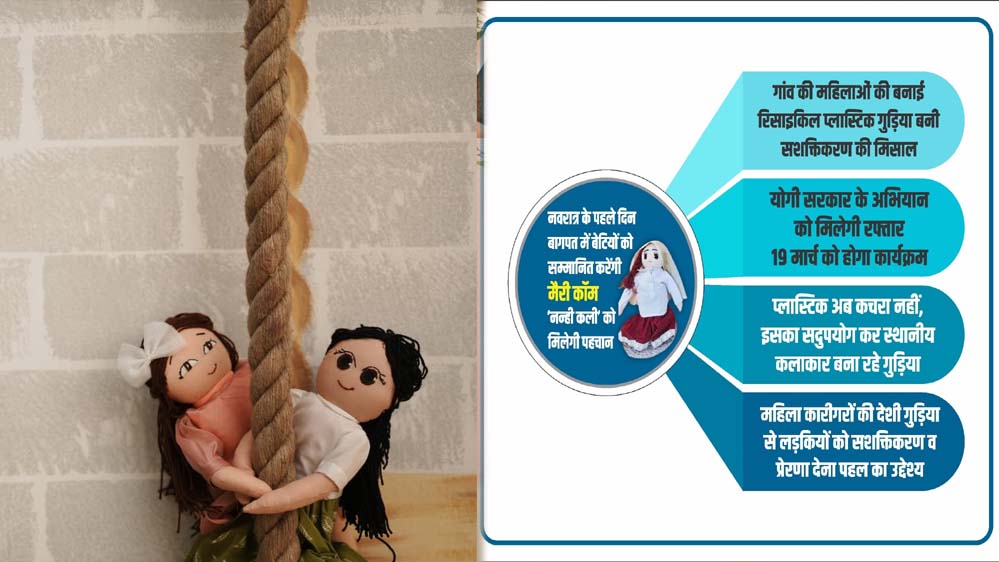 मुख्यमंत्री योगी आदित्य नाथ की मंशा के अनुरूप नवरात्र के पहले दिन बागपत में बेटियों के सम्मान और सशक्तीकरण का एक अनूठा उदाहरण देखने को मिलेगा। छह बार की बॉक्सिंग विश्व चैंपियन मैरीकॉम ‘नन्ही कली’ कार्यक्रम में शामिल होकर बेटियों को सम्मानित करेंगी। गांव की महिलाओं द्वारा रिसाइकिल प्लास्टिक से तैयार की गई गुड़िया ‘नन्ही कली’ इस पहल का केंद्र है। इसके जरिए पर्यावरण संरक्षण, महिला आत्मनिर्भरता और ‘बेटी बचाओ, बेटी पढ़ाओ’ जैसे योगी सरकार के अभियानों को नई मजबूती मिलेगी।