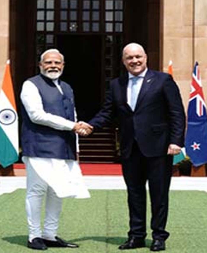 प्रधानमंत्री नरेंद्र मोदी और उनके न्यूजीलैंड समकक्ष क्रिस्टोफर लक्सन ने सोमवार को द्विपक्षीय संबंधों को मजबूत करने, व्यापार का विस्तार करने, रक्षा सहयोग को गहरा करने और भारत-प्रशांत क्षेत्र में शांति बनाए रखने के लिए अपनी सहमति व्यक्त की। हैदराबाद हाउस में वार्ता के बाद मीडिया को संबोधित करते हुए दोनों नेताओं ने आतंकवाद के खिलाफ कड़ा रुख अपनाया और लोगों के बीच आपसी संबंधों को बढ़ाने पर जोर दिया।