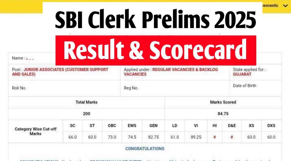 SBI Clerk Prelims Result 2025 OUT: भारतीय स्टेट बैंक (SBI) ने SBI क्लर्क प्रारंभिक परीक्षा 2025 के परिणाम घोषित कर दिए हैं. जो उम्मीदवार SBI क्लर्क (जूनियर एसोसिएट्स) प्रारंभिक परीक्षा के लिए उपस्थित हुए थे, वे अब आधिकारिक पोर्टल sbi.bank.in पर अपना परिणाम देख सकते हैं. जूनियर एसोसिएट्स (ग्राहक सहायता और बिक्री) के पद के लिए प्रारंभिक परीक्षा 20, 21 और 27 सितंबर, 2025 को आयोजित की गई थी. इस परीक्षा में 100 प्रश्न शामिल थे, जिसमें