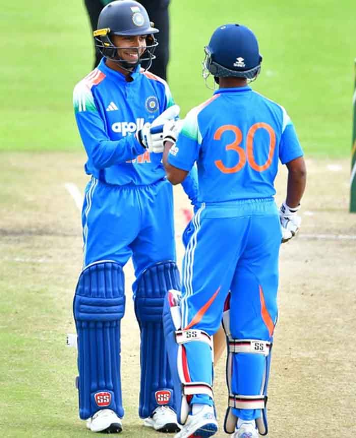 यूथ ओडीआई सीरीज में भारत और दक्षिण अफ्रीका के बीच तीसरा मुकाबला बुधवार को बेनोनी में खेला जा रहा है। भारत ने तीसरे मुकाबले में पहले बल्लेबाजी करते हुए अच्छी शुरुआत की है। भारत को वैभव सूर्यवंशी के रूप में पहला झटका लगा। वैभव 74 गेंद में 127 रन बनाकर आउट हुए। उन्होंने अपनी पारी में 9 चौके और 10 छक्के लगाए। वैभव और आरोन के बीच पहले विकेट के लिए 154 गेंद में 227 रन की साझेदारी हुई। आरोन जॉर्ज 106 गेंद में 118 रन बनाकर आउट हुए। वेदांत 43 गेंद में 34 रन बनाकर आउट हुए। हरवंश रन आउट हुए। अभिज्ञान कुंडू ने 20 गेंद में 21 रन बनाए। कनिष्क 10 और एम्ब्रिश 8 रन बनाकर आउट हुए।