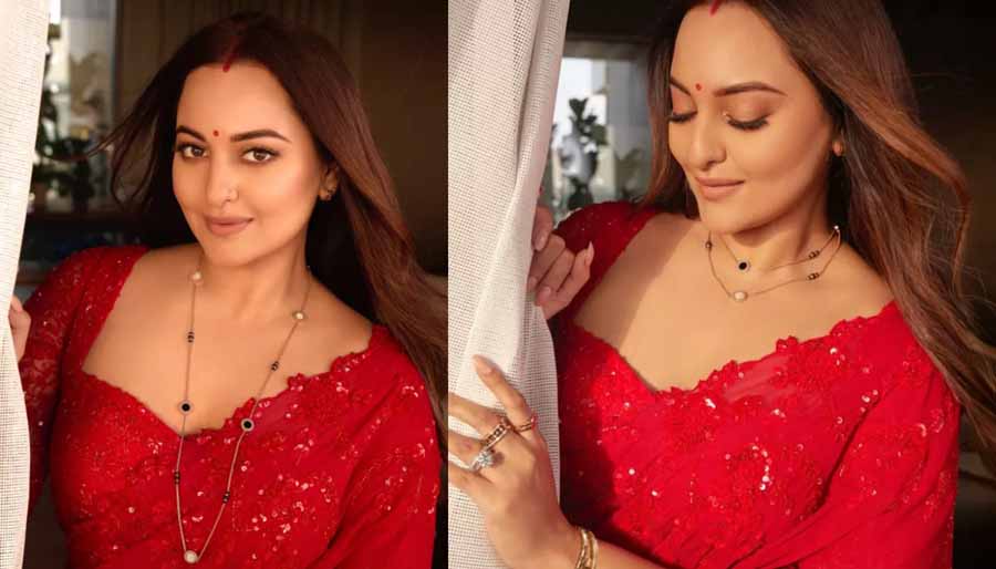 सोशल मीडिया प्लेटफॉर्म इंस्टाग्राम पर सोनाक्षी लाल साड़ी में दिख रही हैं। इसके साथ ही उन्होंने लिखा है ‘आज और हर रोज आपकी लंबी उम्र के लिए प्रार्थना कर रही हूं। श्रीमान पति जहीर इकबाल के प्यार का प्रतीक है यह मंगलसूत्र। ये मंगलसूत्र हमारे एक दूसरे के प्रति लिए वचन की याद दिलाता है।‘रिपोर्ट्स के मुताबिक सोनाक्षी ने पहले करवा चौथ पर नामचीन रोमन हाई ज्वैलर द्वारा तैयार बुलगारी मंगलसूत्र सौतोइर नेकलेस पहना है। यह मंगलसूत्र 18 कैरेट रोज गोल्ड से तैयार किया गया है।