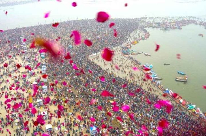 प्रयागराज उत्तर प्रदेश में प्रयागराज के माघ मेले में आज मौनी अमावस्या के स्नान पर्व पर हेलीकॉप्टर के द्वारा श्रद्धालुओं...