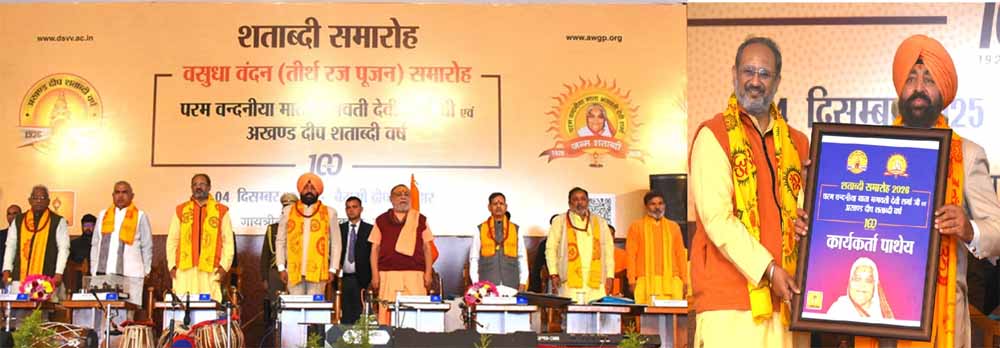 अखिल विश्व गायत्री परिवार के शताब्दी समारोह का शुभारंभ राजा दक्ष की नगरी कनखल स्थित बैरागी कैंप में वसुधा वंदन समारोह के साथ हुआ। समारोह का शुभारंभ उत्तराखंड के राज्यपाल एवं गायत्री परिवार के युवा प्रतिनिधि डॉ चिन्मय पण्ड्या ने हजारों स्वयंसेवक, संत, प्रबुद्धजन की उपस्थिति में 51 तीर्थों से संग्रहीत पवित्र रज-जल का पूजन कर किया। समारोह में अध्यात्म, संस्कृति और सेवा का व्यापक संगम देखने को मिला। यह समारोह परम वंदनीया माताजी के जन्म के 100 वर्ष, अखंड दीप प्रज्वलन के 100 वर्ष और परम पूज्य गुरुदेव की तप-साधना के 100 वर्ष के अविस्मरणीय अवसर को समर्पित रहा। इस दौरान अतिथियों ने विश्व मैत्री, पर्यावरण शुद्धि और सांस्कृतिक एकता का संकल्प लिया।