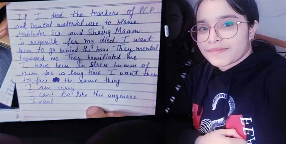 पुलिस से मिली जानकारी के मुताबिक, गुरुग्राम की रहने वाली 21 वर्षीय छात्रा ज्योति, शारदा यूनिवर्सिटी से बीडीएस की पढ़ाई कर रही थी। शुक्रवार की रात छात्र ने हॉस्टल के कमरे में फांसी का फंदा लगाकर आत्महत्या कर ली। इसकी सूचना पर परिजन मौके पर पहुंचे और पुलिस को सूचना दी गई। छात्रा के कमरे से मिले सुसाइड नोट में यूनिवर्सिटी स्टाफ को जिम्मेदार ठहरा गया है। छात्रा ने सुसाइड नोट में उसे मानसिक रूप से प्रताड़ित करने का आरोप लगाया है। इस घटना को लेकर शुक्रवार की रात यूनिवर्सिटी में जमकर हंगामा हुआ। छात्रा ने अपने सुसाइड नोट में लिखा– ''मेरी मौत के जिम्मेदार महेंद्र सर और शार्ग मैम हैं। इन्होंने मुझे मानसिक रूप से प्रताड़ित किया, अपमानित किया।''