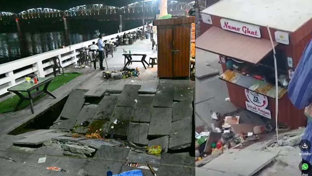 वाराणसी के सबसे प्रसिद्ध नमो घाट पर बुधवार की शाम जमीन धंसने से हड़कंप मच गया। जिस जगह पर जमीन धंसी वहां कई दुकानें भी लगीं थीं। जमीन के साथ ही दुकानें भी एक तरफ लुढ़क गईं। इससे दुकानदार और ग्राहक भाग खड़े हुए। अचानक हुए हादसे से अफरातफरी मच गई। फिलहाल वहां मौजूद सुरक्षाकर्मियों ने रस्सी की बैरिकेडिंग लगाकर लोगों का आना-जाना बंद कर दिया है। हादसे की जानकारी मिलते ही कार्यदायी संस्था और नगर निगम के अधिकारी भी घटना का जायजा लेने के लिए रवाना हो गए हैं।