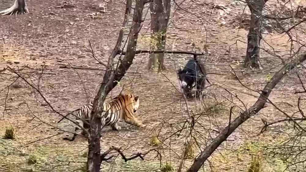 जानकारी के अनुसार, पार्क भ्रमण पर गए पर्यटकों को बाघिन रिद्धि के दो मेल शावकों की साइटिंग हो रही थी। इस दौरान अचानक एक भालू वहां आ पहुंचा और उसका सामना एक बाघ शावक से हो गया। शावक को सामने भालू का यूं आ जाना नागवार गुजरा और उसने हमलावर रुख अपनाते हुए भालू के पीछे दौड़ लगा दी। लेकिन भालू भी पीछे हटने वालों में से नहीं था। वह भी साहस दिखाते हुए शावक के सामने डटकर खड़ा हो गया। दोनों एक-दूसरे को तेज नजरों से घूरते रहे। इस दौरान बाघ शावक ने भी अपनी चाल धीमी कर दी और कुछ पल के लिए बैठ गया।
