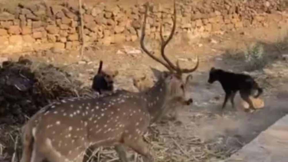 हिरण को कुत्तों से घिरा देख बच्चों ने शोर मचाया