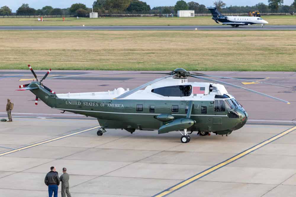 ट्रंप ने ब्रिटेन की यात्रा के लिए मरीन-वन और मरीन-टू हेलीकॉप्टरों का इस्तेमाल किया था जिन्हें 'व्हाइट टॉप' भी कहते हैं। ये हेलीकॉप्टर बेहद सुरक्षित होते हैं जिनमें मिसाइल डिफेंस सिस्टम, रडार और जैमिंग सिस्टम लगे होते हैं। इन्हें परमाणु बम विस्फोट के बाद भी चुंबकीय प्रभावों को झेलने के लिए डिज़ाइन किया गया है। 'मरीन वन' अक्सर अपने जैसे दिखने वाले 2-3 अन्य हेलीकॉप्टरों के समूह में उड़ता है जिन्हें टिल्ट-रोटर विमान 'ग्रीन टॉप्स' कहा जाता है ताकि सुरक्षा में कोई चूक न हो।
